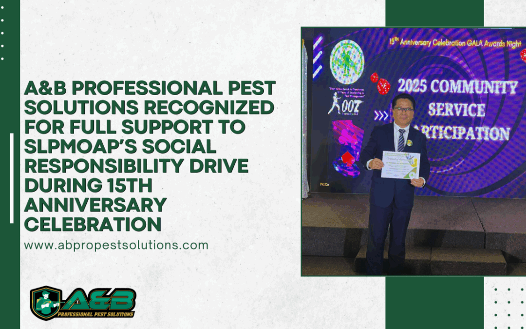 A&B Professional Pest Solutions is honored to receive special recognition for its full support to the Social Responsibility Drive of the Southern Luzon Pest Management Operators Association of the Philippines (SLPMOAP), during its 15th Anniversary Celebration — a milestone event commemorating years of unity, excellence, and service to the community.